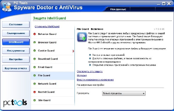 Теперь включает сканирование памяти, профили поведения и карточки отчетов, что обеспечивает надежную защиту и постоянный мониторинг состояния ПК. Spyware Doctor с Антивирусом позволяет безопасно работать в Интернете. Технология ThreatFire™ блокирует новые угрозы быстрее, чем традиционные методы на базе подписей. Система IntelliGuard отслеживает подозрительные действия программ, обнаруживая вирусы, программы-шпионы, следящие файлы cookie, подозрительные объекты ActiveX®, программы-угонщики браузера, регистраторы клавиатуры, троянских коней и т. д.