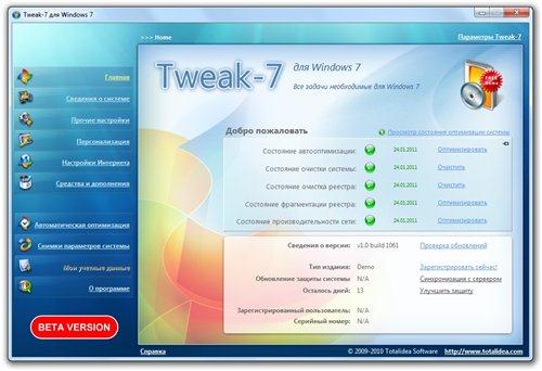 Tweak-7 — твикер для тонкой настройки, оптимизации, тюнинга операционной системы Windows 7, а также её некоторых элементов интерфейса, за счёт изменения определённых параметров (как скрытых, так и труднодоступных для пользователя, находящихся глубо в системном реестре и не только).