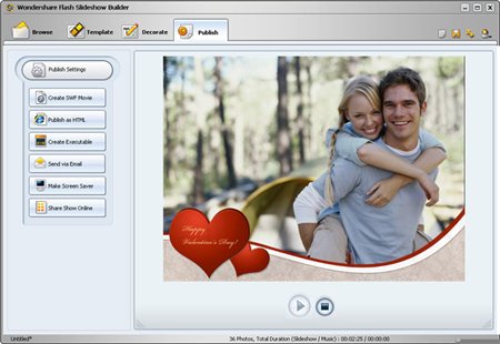 Wondershare Flash SlideShow Builder-простой инструмент, который поможет вам создать красивейшие слайдшоу и цифровые альбомы для размещения на MySpace, Blogger или вашем вебсайте. Используя подготовленные шаблоны, вы легко сможете соединить фотографии и музыку и создать динамический Flash ролик.