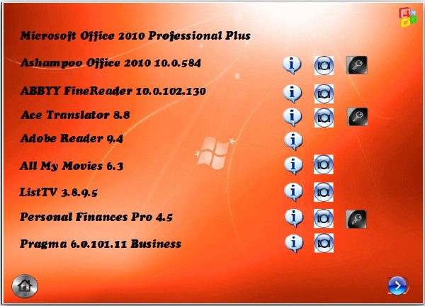 Офис: ABBYY FineReader 10.0.102.130 Corporate Edition Full Repack Ace Translator 8.8.1.583 Adobe Reader 9.4 All My Movies 6.3 Repack Ashampoo Office 2010 10.0.584 EfficientPIM Pro 2.97 ListTV 3.8.9.5 Microsoft Office 2010 Professional Plus v 14.0.4763.1000 (x86-x64) RePaсk Personal Finances Pro 4.5.0.1905 Pragma 6.0.101.11 Business + Cловари 6.0.100.11 Repack ProLing Office 5.0 SP2 Standard PROMT Professional 9.0.443 Giant RePack Punto Switcher 3.2.2.45 RePack TranslateIt! 8.0 build 9 Домашняя Экономика 3.75 Справочник лекарственных средств 2010.0.0.0