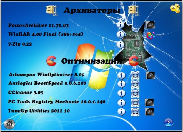 Системные: 7-Zip 9.22 PowerArchiver 11.71.03 Rus Final WinRAR 4.00 Final (x86+x64) RePack + Theme Ashampoo WinOptimizer 8.05 Auslogics BoostSpeed 5.0.6.250 RePack CCleaner 3.05.1408 PC Tools Registry Mechanic 10.0.1.140 TuneUp Utilities 2011 10.0.4000.42 Final Uniblue PowerSuite 2011 3.0.1.3 Windows 7 Manager 2.1.0 Final Ashampoo UnInstaller 4.1.5.0 Total Uninstall Pro 5.9.3 Repack Your Uninstaller! Pro 7.3.2011.02 RePack Hetman Data Recovery Pack 3.0 Ontrack EasyRecovery Professional 6.21.03 Paragon Partition Manager 11 Professional Build 9887 (x86/x64) Driver Genius Professional 10.0.0.712 Total Commander 7.56a Final (MAX-Pack 2011.2.10.1968) RePack