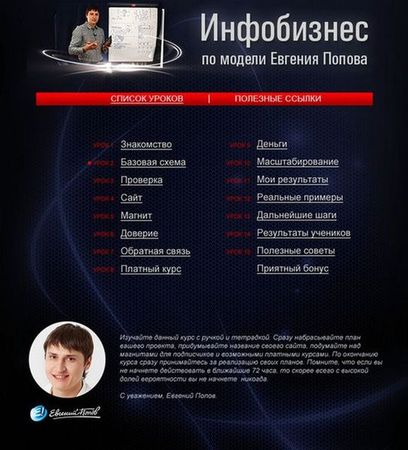 Новый курс Евгения Попова по основам инфобизнеса, над которым он начал работу еще осенью 2012 года. В этом курсе вы найдете 15 видеоуроков, в которых Евгений Попов поделился теми принципами, по которым сам работает уже седьмой год. Это проверенная на практике модель построения успешного инфобизнеса, для тех, кто не ищет халявы, а понимает, что создание и развитие любого бизнеса — это большой труд, который требует самодисциплины и большой самоотдачи особенно на первых этапах своего развития. Содержание курса:1. Что же такое инфобизнес? (Приводит чёткую и понятную схему) 2. Как поделиться своими знаниями? И как сделать так, чтобы люди как можно скорее узнали о Вас? 3. Как привлечь людей на свой сайт? И как обычных посетителей сайта превратить в постоянных читателей? 4. Как сделать "магнит" для подписчиков? И как собрать свою подписную базу клиентов ("золотой актив")? 5. Как построить доверие с базой клиентов? И как поддерживать с ними постоянные отношения? 6. Как узнать что требуют посетители, подписчики и клиенты? Как получить от них обратную связь? 7. Как правильно составить план совего платного информационного продукта? 8. Как сделать эффективную продающую страницу и сделать релиз своего продукта, чтобы люди уже зарание хотели его приобрести? 9. Ка заработать первые деньги со своего обучающего курса? 10. Как организовать и настроить свою партнёрскую программу и вести переписку с "новыми" подписчиками? 11. О многих других интересных вопросах инфобизнеса.