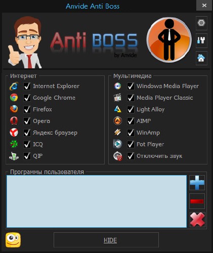 Anvide Anti Boss - бесплатная утилита которая позволяет быстро скрыть от посторонних глаз все указанные и выбранные окна с экрана компьютера и даже отключить звук.
