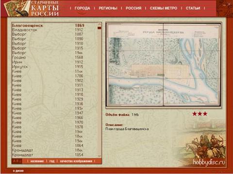 Сборник содержит около 600 оцифрованных КАРТ городов и различных областей России и УКРАИНЫ XVI-XX веков. Большинство карт имеет достаточно высокое разрешение и сопровождается краткой информацией: год издания, автор, общее описание. Карты разбиты на условные категории: ГОРОД, Области, Россия, Схемы метро. Диск оснащен удобной графической оболочкой с системой сортировки (по названию, году и качеству изображения), позволяющей легко найти нужную карту, и встроенной программой для детального просмотра карт.