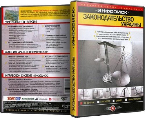 ИНФОДИСК: Законодательство Украины (июль 2011) - это система, разработанная как мощный инструмент для ежедневной работы с правовой базой и поиска нужного нормативного акта в считанные секунды. Содержит законодательную базу Украины - более 120 000 документов: все Кодексы, законы, документы практически всех органов законодательной и исполнительной власти, международные договора и соглашения в действующих редакциях. Для удобства пользователей База законодательства систематизирована по трем классификаторам: по издающему органу, по типу документа, по тематической и отраслевой принадлежности документов. Выделены блоки: Новости законодательства, государственные классификаторы, типовые договора и бланки, справочники.