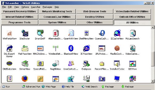 NirLauncher Package - пакет из более чем 100 маленьких утилит, которые однако могут быть очень полезны. Включает в себя программы для восстановления паролей, инструменты для работы с сетью, видео и аудио, просмотра кеша браузеров, файловые утилиты, системные утилиты для просмотра реестра, загруженных драйверов, управления расширениями оболочки и многое другое. Пакет портативен и может запускаться с любого носителя информации, без инсталляции.