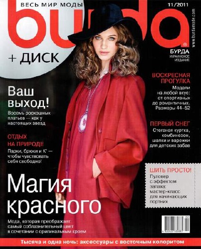 Burda – известный журнал по шитью с выкройками и инструкциями. В выпуске - оригинальная коллекция в красном для самых смелых модниц; гламурные модели из кожи, меха, шелка и парчи; роскошные платья, созданные для Барбары Шонебергер; парки, брюки и другие вещи для взрослых и стеганые куртки, комбинезоны, шапки для детей.