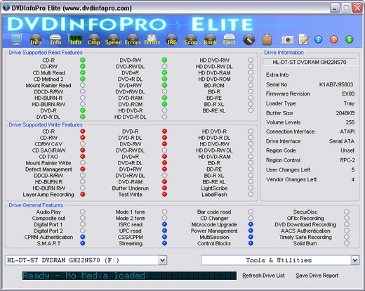 DVDInfo Pro - утилита для тестирования и получения подробной информации о CD/DVD, Blu-ray и HD-DVD-приводах и диках. Кроме этого, данная программа позволяет тестировать установленные в привод компакт-диски и DVD, а также быстро стирать и форматировать диски DVD-R/RW и DVD+R/RW. Поддерживаются практически все виды приводов, включая DVD+R DL (Double Layer), и все виды дисков, включая Blu-ray и HD-DVD. DVDInfoPro - это, конечно, не лекарство. Это лишь одна из утилит диагностики. Nero плюс DVDInfoPro - получается целый «врачебный» консилиум и для «резака» вашего компьютера, и для коллекции самостоятельно записанных дисков.