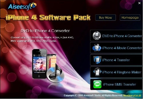 Aiseesoft iPhone 4 Software Pack тара кодов, подключающий в себе преобразователь аудио, видеоматериал файлов разных форматов и граббер видеоматериал и DVD в форматы про Apple iPhone, помощь MPG, MPEG, MPEG2, VOB, MP4, M4V, RM, RMVB, WMV, ASF, QT, TS, MKV, AVI, 3GP, FLV, MPV, MOD, TOD и остальных форматов в iPhone/iPhone (3G) MP4, H.264, MOV, M4V, вытяжка аудио изо видеоматериал и DVD в AAC, MP3, WAV, AIFF, M4A форматы, преобразователь меж MP3, MP2, AAC, AC3, WAV, MID, MIDI, WMA, M4A, RA, RAM и иными аудио форматами, творение рингтонов изо аудио и видеоматериал файлов, помощь iPhone, iPhone (3G), iPod, iPod nano 4, iPod touch, iPod touch 2, iPod classic, iPod shuffle, Apple TV и остальных, подготовительный выверка видеоматериал, стопочный распорядок службы, наладка характеристик хранения с избранием изо перечня обычных.