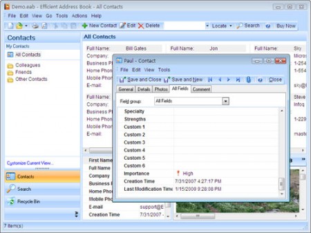 Efficient Address Book - адресная книга для ведения базы данных ваших партнёров, коллег, друзей и знакомых. Неограниченная возможность построения иерархических списков, сортировка данных по выбранным группам, возможность редактирования и добавления полей в базу данных, возможность вставки в контакт фотографий, графических изображений и меток, гиперссылок, комментариев, таблиц и приложений. Программа имеет сменный интерфейс, удобную систему поиска и функции импорта\экспорта данных.
