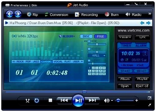 Cowon JetAudio - All in One -всё в одном - проигрыватель аудио и видео файлов, риппер, конвертер и т.д.,. Поддерживаются практически все аудио форматы, умеет проигрывать MP3, MP2, WAV, MID, REAL AUDIO/VIDEO, S3M, MOD, MPG, AVI, MOV, Video/Audio CD, RealPlayer G2 и некоторые другие форматы медийных файлов. Запись аудио компакт-дисков или возможность сделать копии их содержимого на Ж. Диск ПК. Имеется возможность накладывать на композиции различные эффекты ...