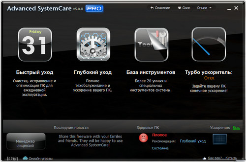 Advanced SystemCare Pro - набор утилит для оптимизации системы. Проводит анализ системы, после чего производит оптимизацию системной конфигурации, в том числе изменяет на оптимальные настройки безопасности, удаляет из системы Spyware и Adware, исправляет ошибки в системном реестре, удаляет временные файлы, оптимизирует параметры интернет-соединения, позволяет управлять автозагружаемыми приложениями, производит дефрагментацию файловой системы и т.д.