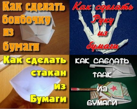 В видеоуроках вы научитесь делать оригами. А именно сделаем танк, стакан, бомбачку, руку, и все это из обычной бумаги.