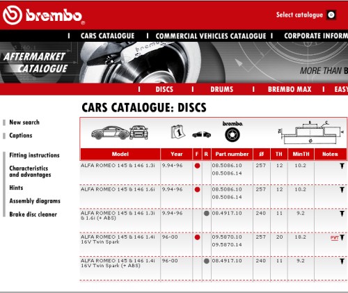Электронный каталог тормозных дисков и барабанов Brembo для европейских автомобилей. Подбор по моделям машин, и уникальная возможность подбора по размерам. Кроссы на оригинальные номера и других производителей, таких как JURID, Textar, ATE, Lucas, Ferrodo и многих других.