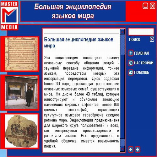 Эта энциклопедия посвящена самому основному способу общения людей – звуковой передаче информации, прочее языками, посредством которых эта информация передается. Диск содержит более 30 карт, отражающих расположение основных языковых семей, существующих в мире.