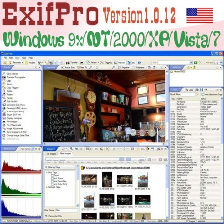 ExifPro v1.0.8 - Это приложение, предназначенное для отображения, обработки и просмотра фотографий. Программа позволяет отображать изображения в нескольких режимах. Выделенные изображения вы сможете копировать, изменять в размерах, обрезать и всячески настраивать, используя инструменты, встроенные в программу. Также данная программа позволяет отображать EXIF информацию, встроенную в фотографии, описывающей различные параметры фотокамеры, которая была использована во время снимка. С помощью программы можно создавать HTML альбомы, слайд-шоу, с использованием встроенных в программу генераторов, печатать изображения, добавлять описания и теги к изображениям...
